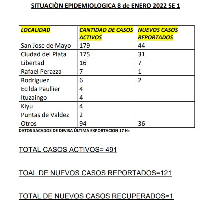 Según el informe correspondiente a este sábado 8 de enero se registraron 121 casos nuevos de coronavirus en San José, principalmente en la capital departamental y Ciudad del Plata. Solo 1 persona se recuperó hay cerca de 500 casos activos.