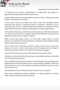 La Federación Rural emitió un comunicado oficial expresando su profundo dolor e impotencia ante la muerte del productor y agrimensor Álvaro Hiriart, ocurrida en la zona de Andresito, departamento de Flores. El trágico desenlace se produjo en el marco de un operativo policial derivado de un incidente con perros que atacaban a su ganado.
